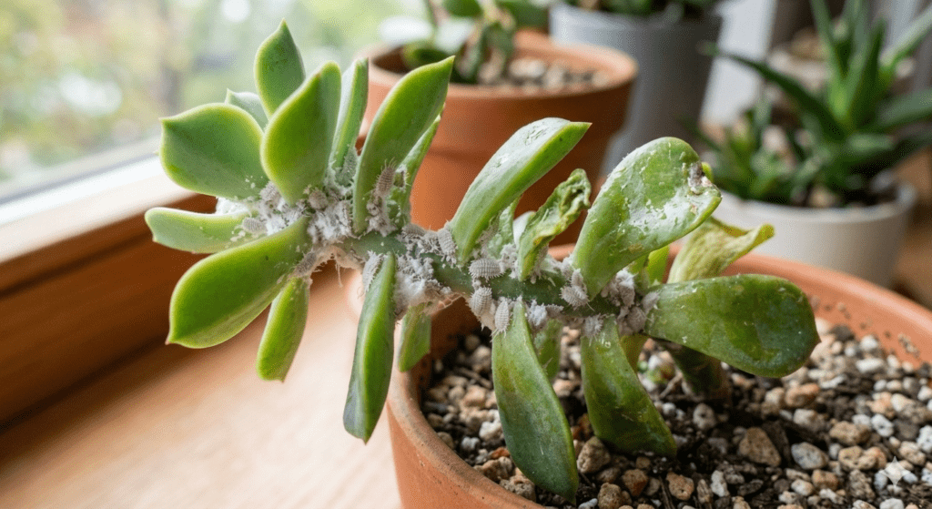 Succulents are particularly prone to mealybugs due to their tight leaf rosettes, which give bugs a great hiding spot. Use a cotton swab dipped in rubbing alcohol to remove them manually, then follow up with a diluted neem oil spray. Avoid excess moisture as succulents do not appreciate being drenched.