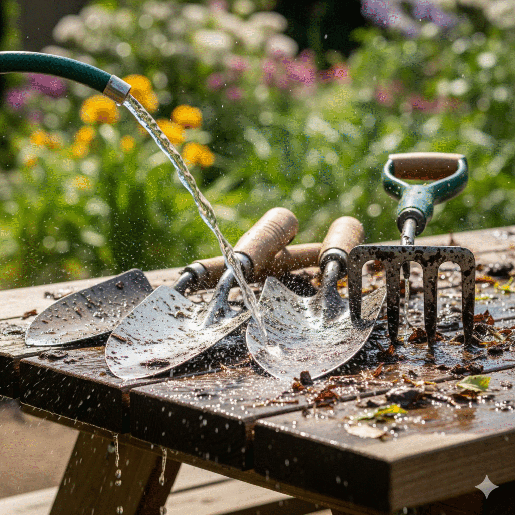 After you have finished using a tool, you should first scrape the dirt off the tool. You can use a stick or a knife to remove the soil. On the other hand, you can use a spray nozzle to wash off the dirt; it’s fast and more accurate.