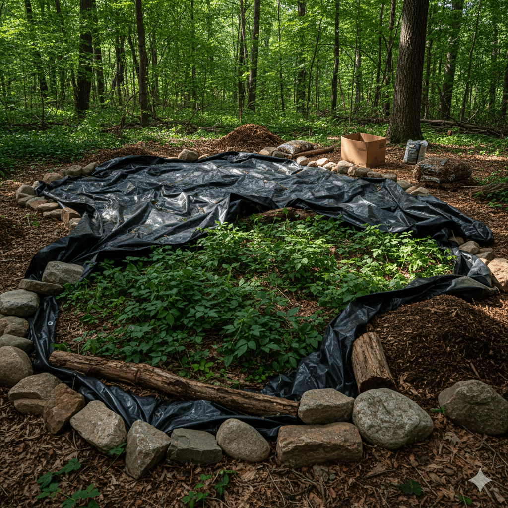 If you prefer a chemical-free method, smothering the plants is a safe and reliable option. This approach involves covering the infested area with thick black plastic sheets, cardboard, or mulch to cut off sunlight and airflow.