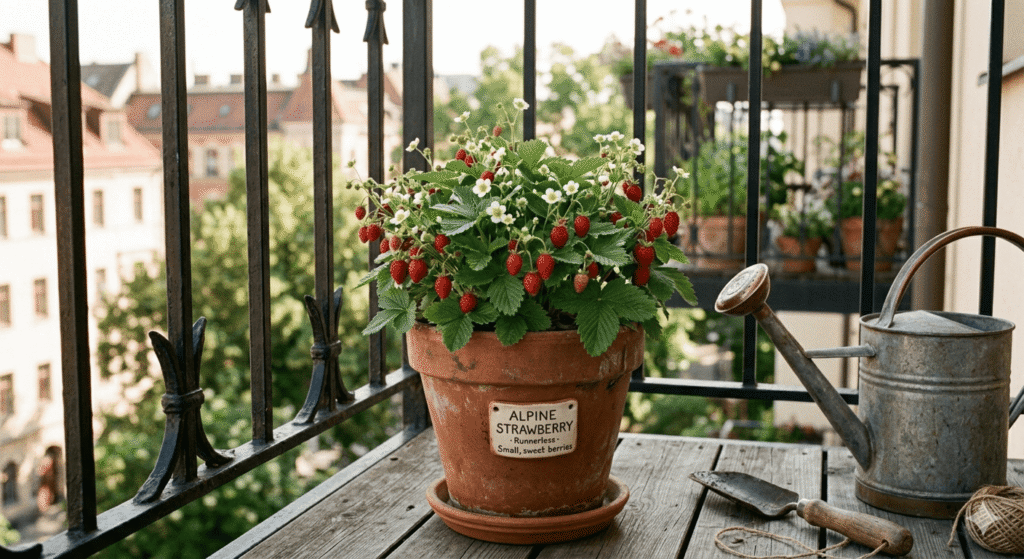 If you are working with very small pots or want to grow strawberries on an apartment balcony without much space, alpine strawberries are worth considering. Varieties like Alexandria and Mignonette are compact, produce masses of small, intensely flavored berries, and are very tolerant of partial shade. They are also virtually runner-free, keeping your containers neat and manageable.