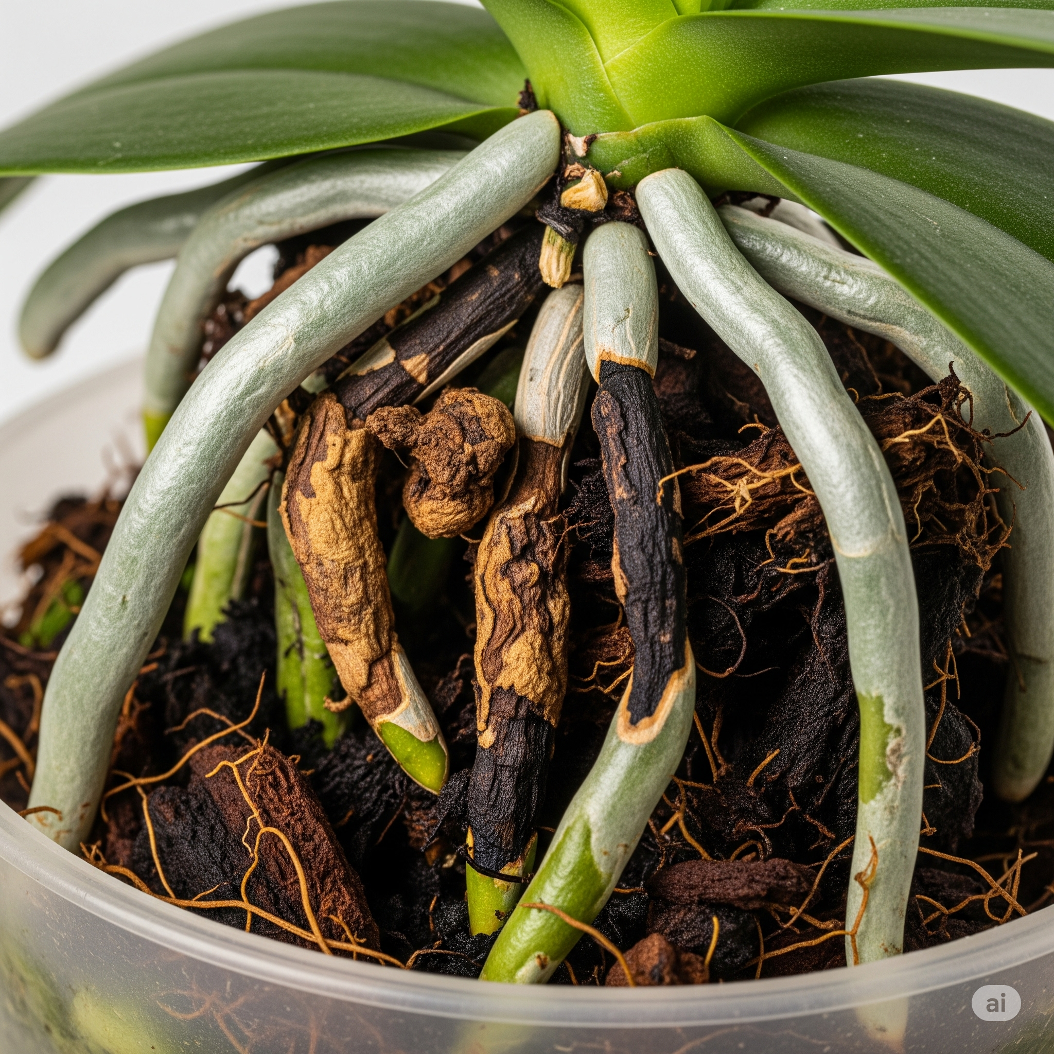 As root rot progresses, the roots become mushy and discolored and can emit a foul odor. The decayed roots lose their ability to absorb water and nutrients effectively, compromising the overall health and vitality of the orchid plant.